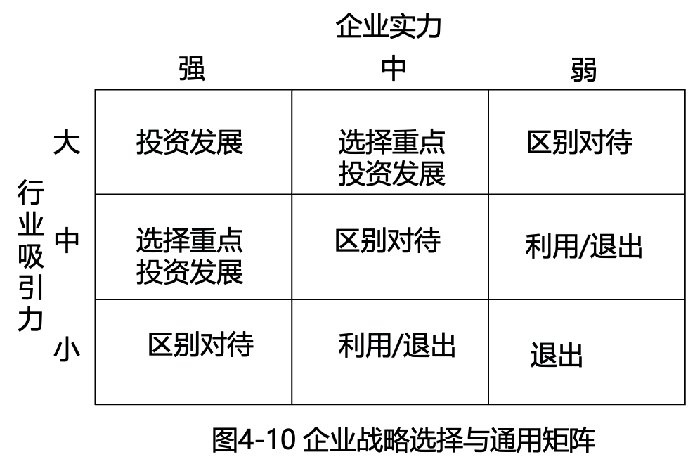 - 撤退战略 在那些没有发展机会或者发展潜力很小的行业和市场逐渐退出,包括紧缩战略、转向战略和放弃战略。